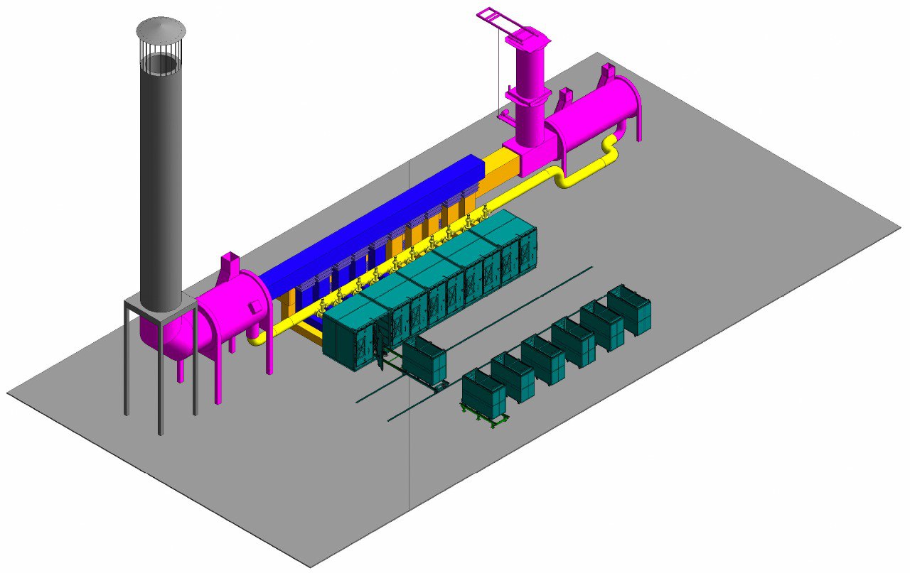The furnace operates using a pyrolysis process, meaning the raw materials are heated without access to oxygen, resulting in the formation of combustible pyrolysis gases. These gases serve as the primary fuel for the furnace during its operation. Additionally, the furnace generates excess thermal energy, part of which is used to maintain its own thermal processes, while the rest can be utilized for various industrial and domestic purposes.